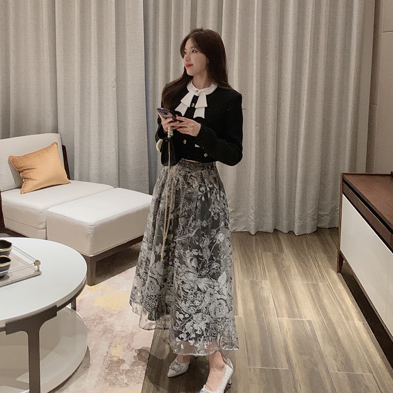 Organza black skirt autumn and winter 2022 new high-waist French A-line mid-length skirt