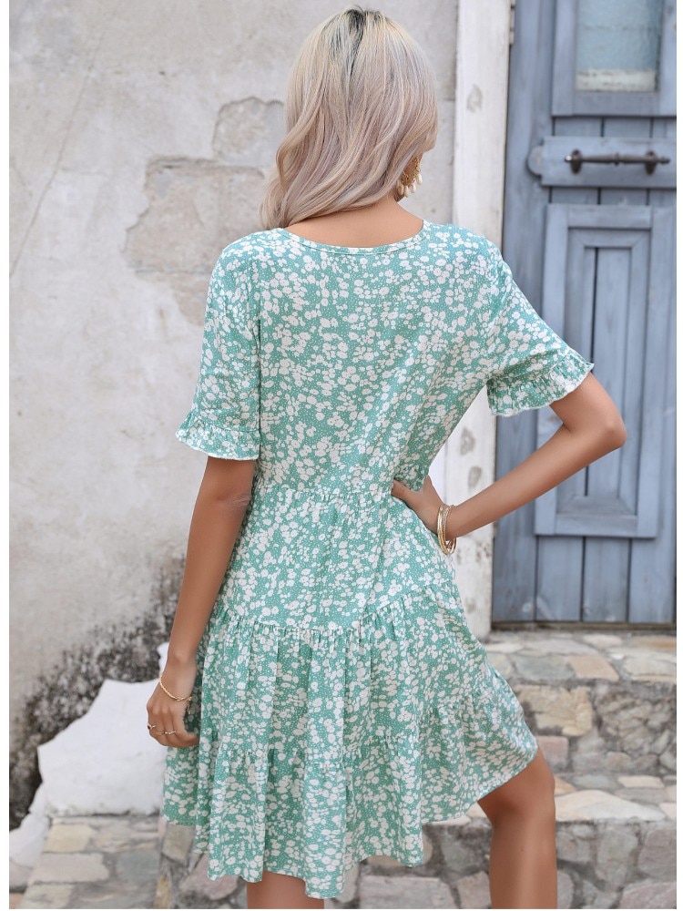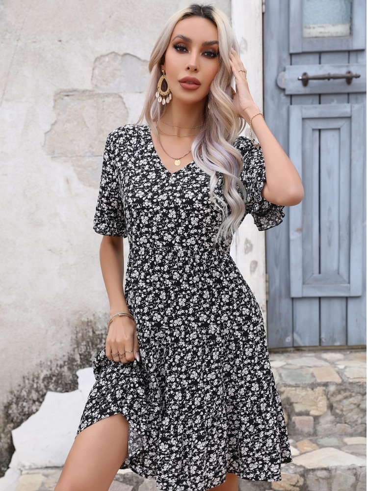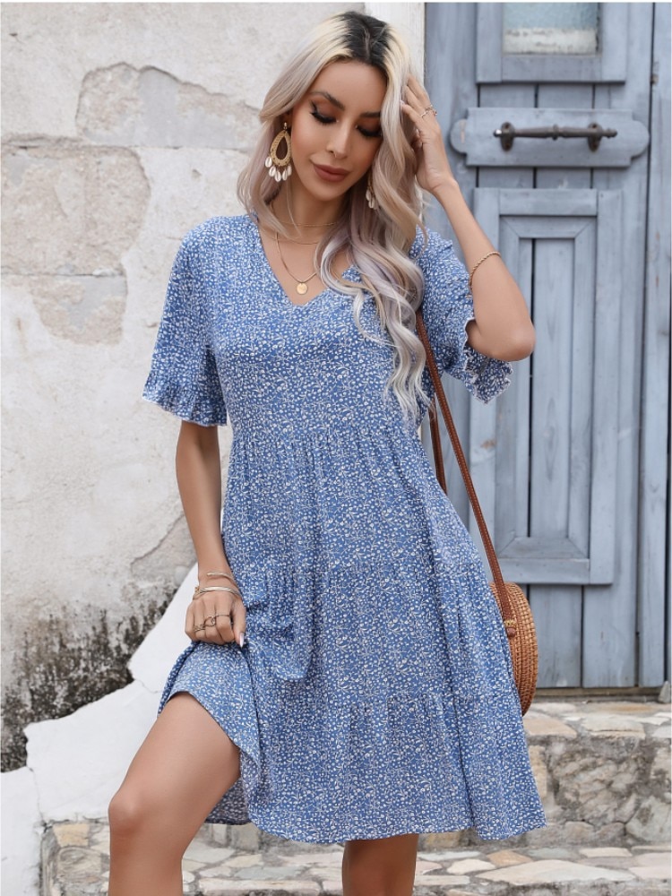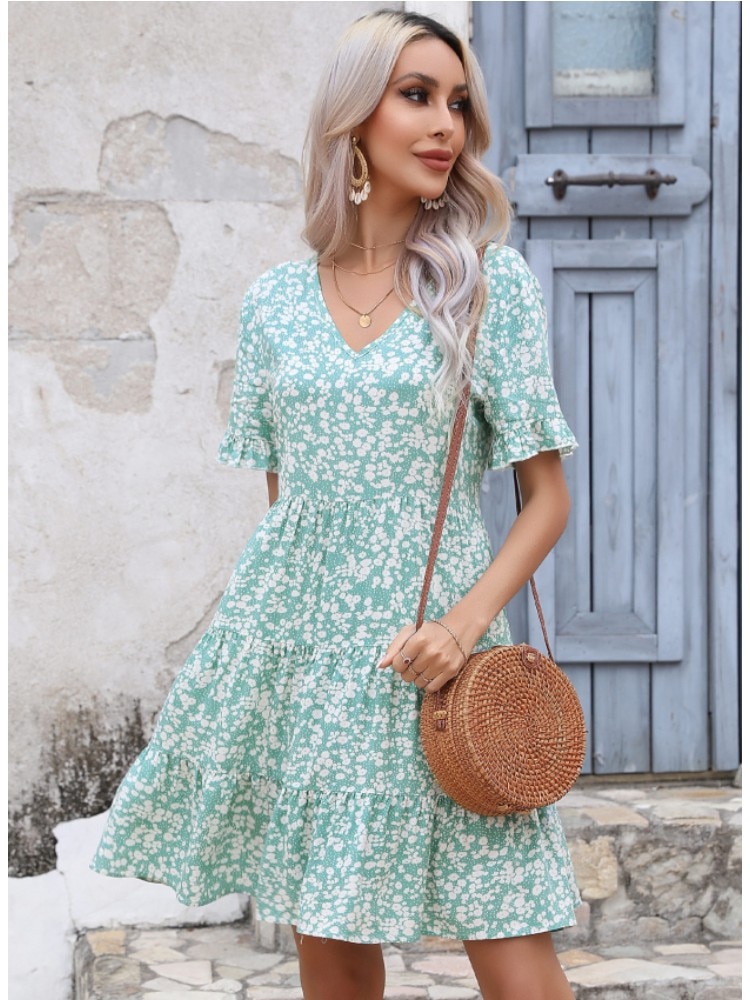 Ladies Vintage Summer Dress Floral Print Loose Dress Women Casual V-neck Ruffles Mini Dress 2023 Fashion Beach Sundress Vestidos